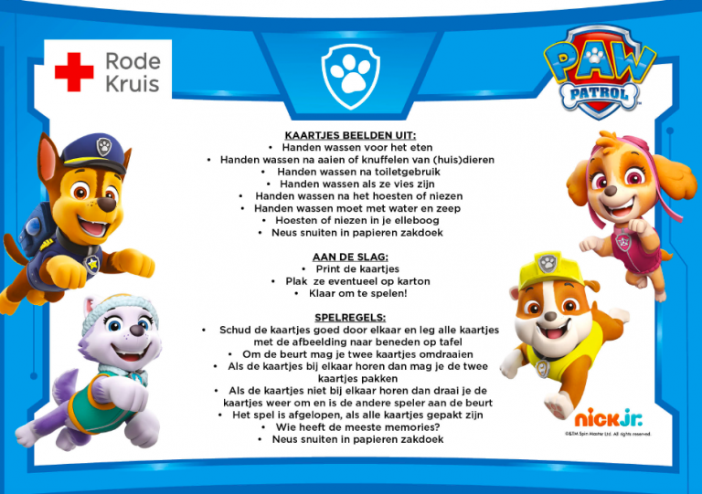 In samenwerking met het Rode Kruis hebben wij een DIY PAW Patrol spel gemaakt! Hygiene is belangrijk, zeker in de huidige situatie. Het is daarom belangrijk dat je kindje de beste hygiene en handen was technieken leert. Met dit spel kan je plezier en leerzaamheid gemakkelijk combineren! Klik op de foto en een PDF bestand zal verschijnen om uit te printen. Veel plezier!